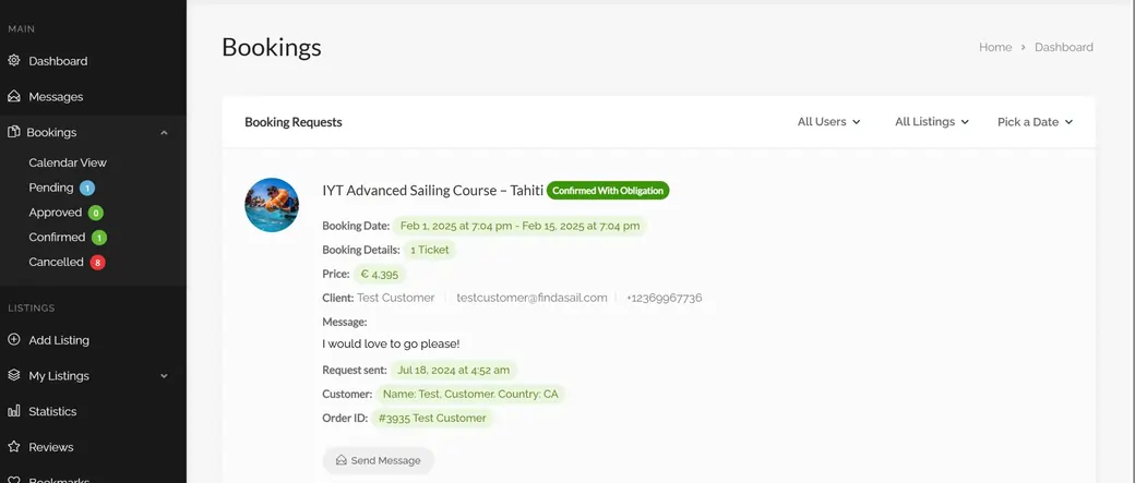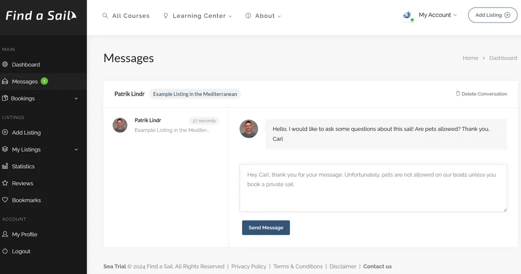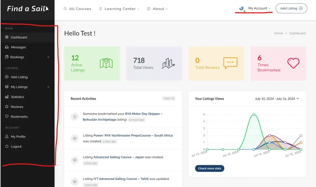 Dashboard is your central hub where you can manage everything related to your Find a Sail profile, bookings, communications, listings, statistics, and reviews. The dashboard overview gives you a quick sumup of your listings, trends, and statistics.
