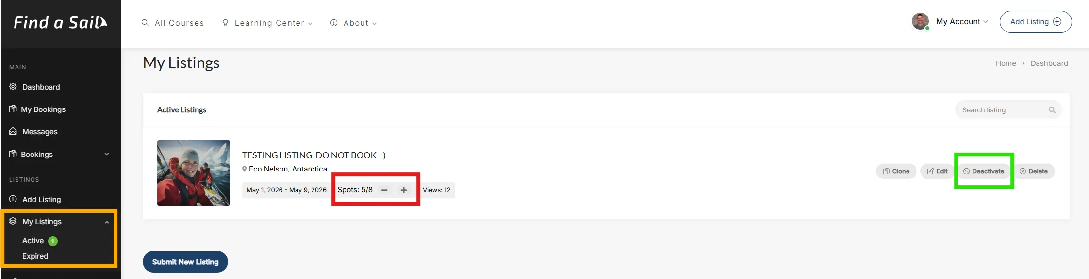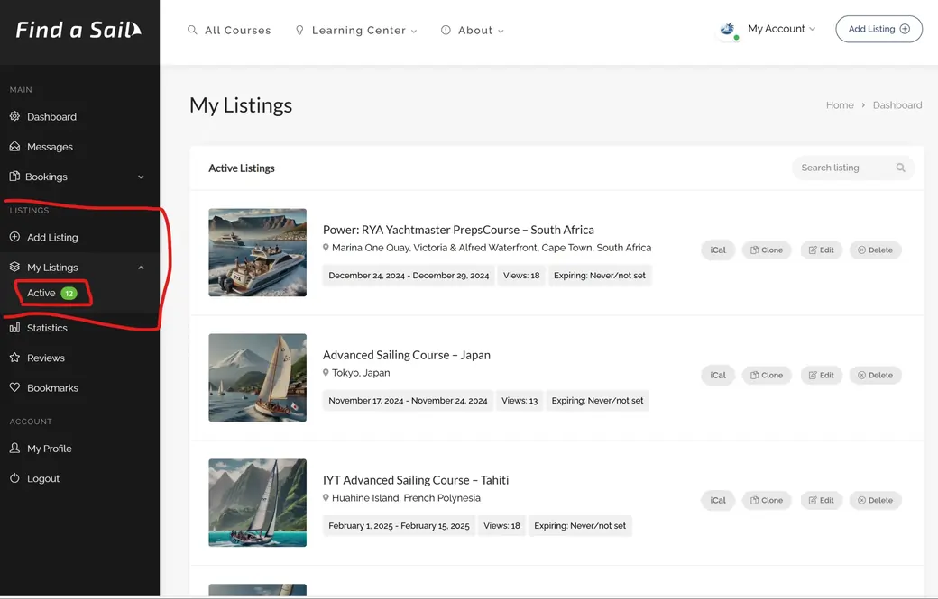 In the “My Listings” section, you can view, edit, and manage your active listings. You can also use the Cloning feature to duplicate a listing with new dates, which is handy if you run the same course every week!