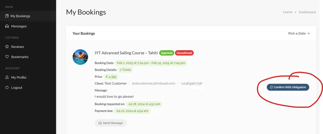 - Payment: Please communicate with the client directly, send them an invoice, and finalize the booking using your regular payment process. (Tip: Make sure you describe the payment methods available, deposit & balance policy, refund, and cancellation policy in your T&Cs uploaded to Find a Sail through your profile.)