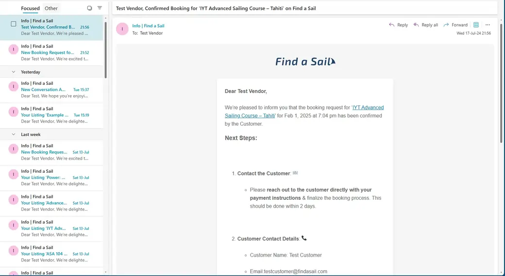 Tip: We recommend adding @develop.findasail.com to your email’s safe sender list to ensure you don’t miss any important bookings and communications!